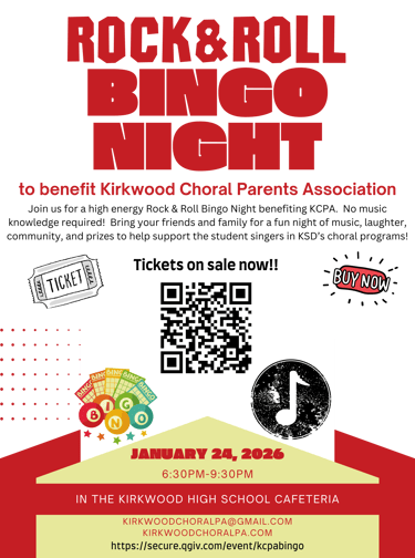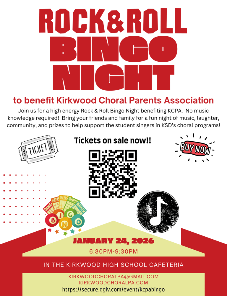 The Kirkwood Choral Parents Association is a new organization dedicated to supporting the choral music program in the Kirkwood School District. In partnership with the choral directors, KCPA works to enhance the educational and performance opportunities available to all choir students. The association will provide assistance through fundraising, event coordination, and volunteer support. KCPA fosters a strong sense of community among students, family, and staff, promoting pride in the Kirkwood Choirs and a shared commitment to musical excellence. Through its efforts, the association will help sustain and enrich one of Kirkwood’s most vibrant and valued performing arts programs.